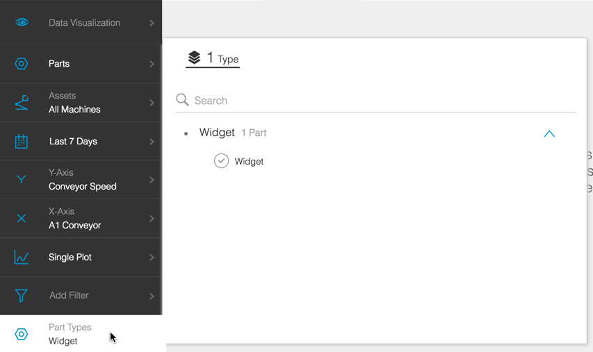 Note: When you select Parts from the Data Type selector, a Part Type option displays in the Filter Bar so you can select parts.